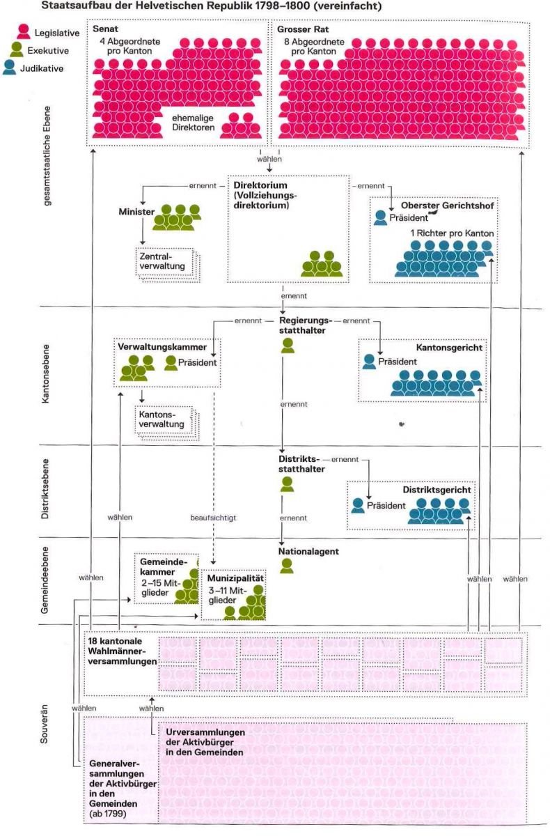 Zum Verständnis der helvetischen Verfassung und der Verwaltungsstruktur sind im Folgenden nach einer graphischen Übersicht die wesentlichen Organe und ihre grundsätzlichen Kompetenzen aufgelistet: