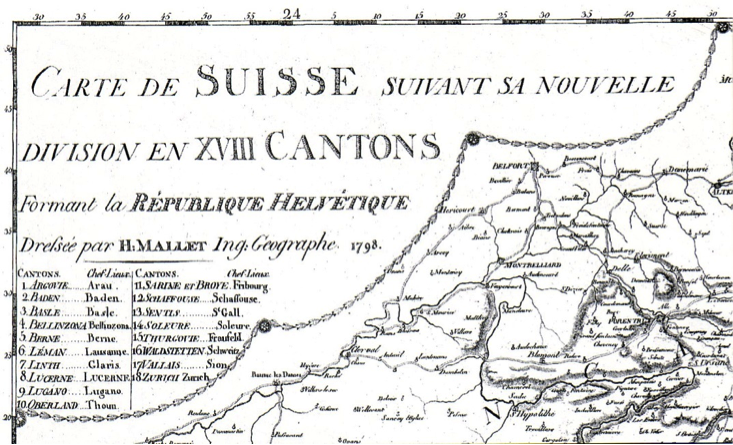 Diese veränderte Einteilung der Schweiz nach dem 4. Mai 1798 zeigt die Karte von Wilhelm Haas (Abb. 2), die im August 1798 herausgegeben wurde (Der Helvetischen Republik neue Cantone und Districte Eintheilung nach den gesetzlichen Beschlüssen. Dem Vollziehungs-Directorium gewiedmet von Wilhelm Haas dem Sohne, in Basel, im Augstmonat 1798). Sie erschien am 15. August 1800 auch als Beilage zum Schweizer Boten. Als helvetischer Grossrat gehörte sein Vater Wilhelm verschiedenen Kommissionen für Gebietseinteilungen der Kantone an. Wilhelm Haas hatte also durch die Tätigkeit seines Vaters Zugang zu den neuesten Informationen. Ebenfalls 1798 erschien die Carte de Suisse suivant sa nouvelle division en XVIII cantons formant la République Helvétique des Ingenieur-Geographen Henri Mallet. Sie zeigt den Stand nach dem 26. Mai 1798 (Abb. 3). Im Ausland galt diese Karte damals als erste Karte, die die neue Einteilung der Helvetischen Republik zeigte.
