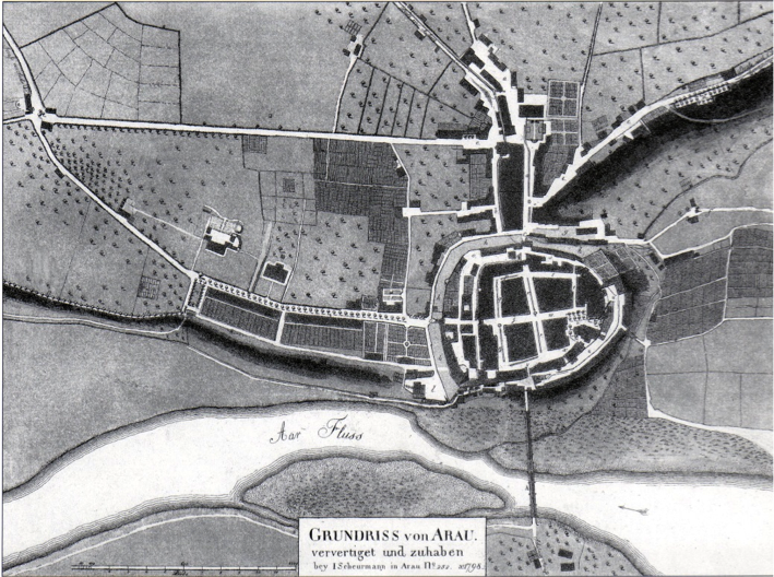 Ein zentralistischer Staat wie die Helvetische Republik brauchte im Gegensatz zum Staatenbund der Alten Eidgenossenschaft eine Hauptstadt. Zur ersten Hauptstadt wurde am 3. Mai 1798 Aarau auserkoren, wo ja auch die letzte Tagsatzung der Alten Eidgenossenschaft stattgefunden hatte. Da dieser Ort die nötige Infrastruktur für eine Hauptstadt nicht besass, wurden sofort Anstrengungen unternommen, diesen Mangel auszugleichen, indem ein neues Regierungsviertel geplant wurde. Ein Plan von Scheurmann zeigt die Hauptstadt Aarau: Grundriss von Arau, 1798 (Abb. 5). Das Dekret über die Erhebung Aaraus zur Hauptstadt wurde jedoch wiederum zurückgenommen und am 7. August Luzern zum neuen Sitz der Regierung erkoren. Am 20. September fand die letzte Sitzung in Aarau und am 4. Oktober die erste Sitzung in Luzern statt. Als diese Stadt während des Zweiten Koalitionskrieges in die Nähe des Frontbereichs geriet, sah sich die helvetische Regierung gezwungen, ihren Sitz am 28. Mai 1799 nach Bern zu verlegen, von wo sie am 23. September 1802 nach Lausanne floh. Am 18. Oktober kehrte sie wieder nach Bern zurück und blieb dort bis zu ihrer Auflösung am 10. März 1803. Als durch die Mediationsakte die Schweiz wieder ein Staatenbund mit nur lockerem Zusammenhalt wurde, war eine einzelne Hauptstadt nicht mehr nötig, und der Regierungssitz wechselte jährlich unter den sechs Vororten.