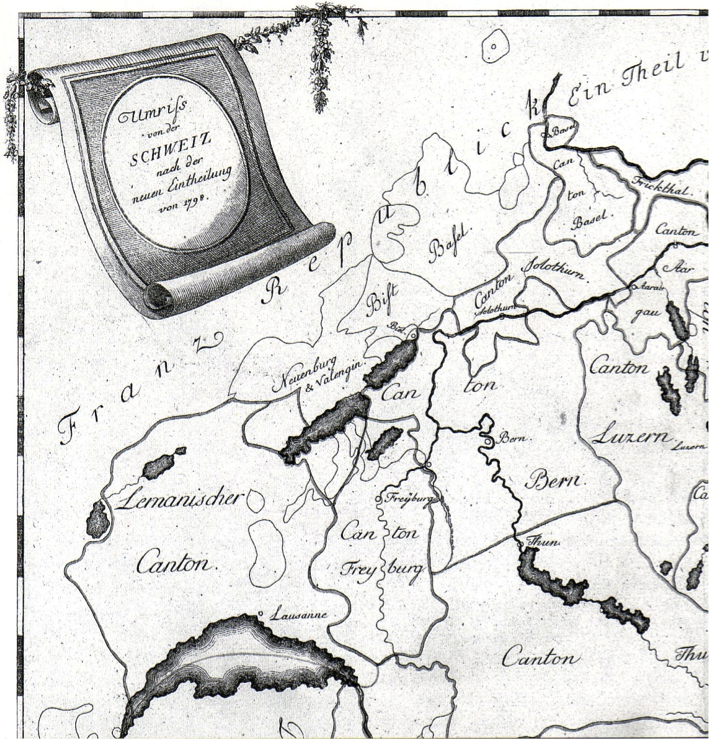 Die Gebietseinteilung ist auf einer anonymen Karte dargestellt (Umriss von der Schweiz nach der neuen Eintheilung von 1798). Ein Kanton Thun (= Oberland) ist verzeichnet, der Kanton Zug umfasst noch den späteren Kanton Baden. Sie zeigt also den Stand zwischen dem 16. März und dem 11. April 1798 (Abb. 1). Die erste Helvetische Verfassung wurde am 12. April 1798 in Aarau von den Vertretern der dort anwesenden zehn Kantone angenommen. Weil die Innerschweiz und die neuen Staaten in der Ostschweiz die Annahme der Helvetischen Verfassung verweigerten, wurden diese durch ein Ultimatum zur Annahme gezwungen und diejenigen Orte, die trotzdem Widerstand leisteten, in einem blutigen Feldzug unterworfen. Noch bevor deren Gesandte in Aarau eingetroffen waren, wurde für die aufständischen Gebiete eine neue Gebietseinteilung vorgenommen, mit dem Zweck, die Anzahl der Kantone und damit auch die Verwaltungskosten zu verringern und durch die Aufhebung der kleinen Kantone deren Einfluss zu beschneiden. Ebenfalls sollte der Kantons- und Lokalgeist bekämpft werden, der dem Ideal der Gleichheit aller Bürger und der Entstehung eines helvetischen Nationalbewusstseins entgegenstand. Diese Einteilung wurde schliesslich nach französischem Diktat vorgenommen.